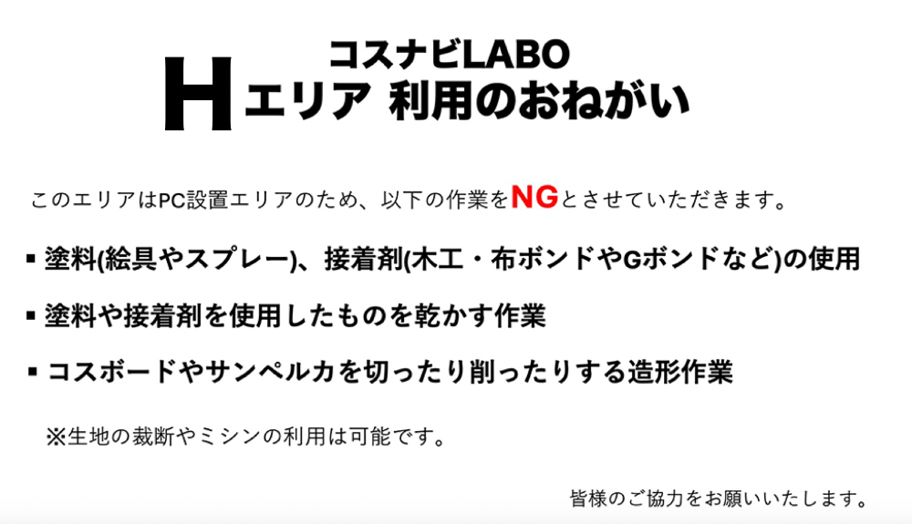 コスナビLABOは作業場です。静かな環境づくりにご協力ください。