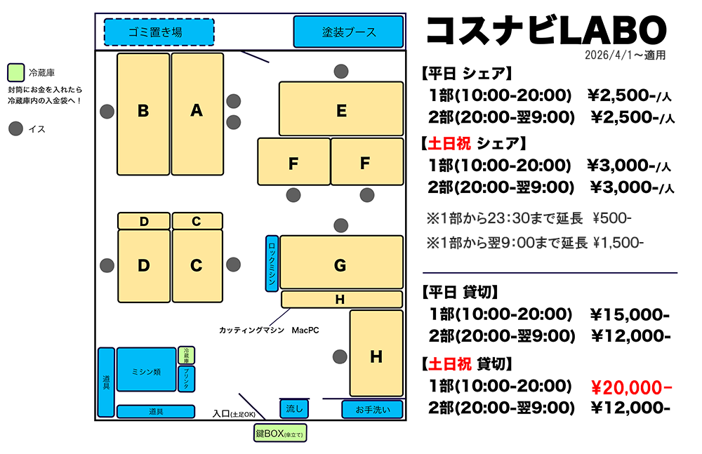 とのお申し出があり、トラブルになるケースがございました。そのため、今後の混乱やトラブルを避けるため、2026年4月1日より料金を統一させていただきます。また、座席数が1つ増えたことに伴い、土日祝の貸切料金を18,000円から20,000円へ改定させていただきます。何卒ご理解のほどよろしくお願いいたします。LABOは低価格を実現するため、セルフ運営にて、利用者の皆様のモラルを前提に運営しております。そのため、クレームが著しく多い方、お支払いに応じていただけない方、LABOのルールを守っていただけない方につきましては、ご利用・ご参加をお断りする場合がございます。皆様に気持ちよくご利用いただくため、ご理解とご協力のほど何卒よろしくお願いいたします。